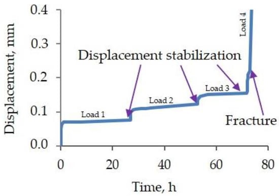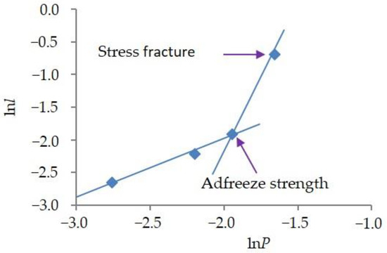 The testing was performed by incremental stepwise loading to determine shear strength along the adfreezing surface (Raf). The magnitude of load at the first and subsequent steps was chosen to provide at least four loading steps before fracture. Each step lasted till displacement stabilization, which was assumed to correspond to displacement increment of 0.01 mm for 12 h. Each following step began after complete stabilization of the previous step. The tests stopped when displacement progressed at an increasing rate, i.e., till fracture at the soil-pile contact. The shear strength along the adfreeze surface was determined as the highest shear stress at which displacement stabilized. The data were processed using creep curves (ε, mm, vs. t, h) (Figure 5) and log-log stress–displacement curves (shear stress vs. total displacement at the time of stabilization, lnτ vs. lnε) (Figure 6).