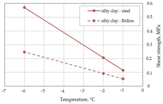 Temperature dependence of shear strength: silty clay-steel and silty clay-Reline.