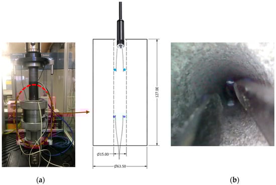 A hollow cylinder test is used to apply an axial load and an external pressure along the curved surface of the cylinder specimen that provides a ready method for studying the strength. The modified Hoek cell designed and manufactured by Hashemi and Melkoumian [20] consisting of two sets of cylindrical platens was used for conducting the TWHC tests. A micro camera was fitted inside the test cell to monitor and record the borehole wall in real time. The Hoek cell was synchronised with a pressure maintainer specifically tuned for applying a low confining pressure without leakage. The CMDs were placed inside the TWHC specimen as shown in Figure 2a. A hollow cylindrical metal spacer made from hardened steel matching the diameter of the TWHC specimen was placed in between the specimen and the hollow platen to maintain the CMD in the vertical position during testing. A total of two CMDs were used for each test to improve the accuracy of the convergence measurement. The top CMD was placed alongside the camera and approximately 42 mm from the top end surface of the specimen, and the bottom CMD was placed on the direct opposite location of the top CMD.
