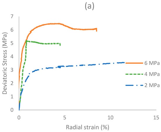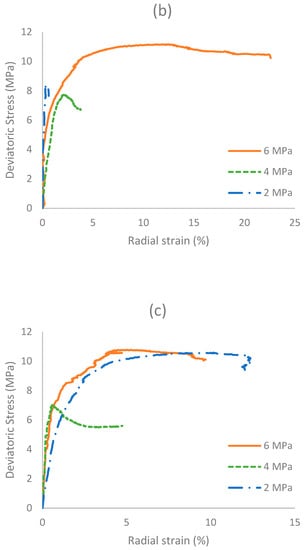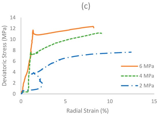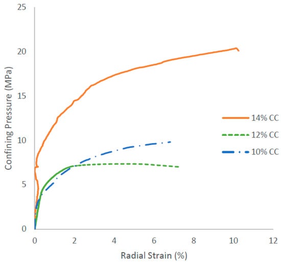 In the first stress path, both the axial stress and the confining pressure were increased simultaneously at the same rate up to the pre-defined level, in order to simulate hydrostatic condition on the boundary of the specimens. Then, in the second step, the specimen was subjected to an axial loading increment corresponding to a constant displacement rate of 0.07 mm/min. During the test, the level of the confining pressure applied to the external surface of the specimens was kept constant by an automatic pressure gauge system. The results showed the relatively linear function of the deviatoric stress followed by a constant increase in the radial strain as the borehole failure initiated. As shown in Figure 4a–c, this behaviour was more profound at a lower level of cement content of 10% compared to specimens with a higher cement content of 12% and 14%. Prior to the initiation of the borehole failure, the radial strain of the specimens with a higher amount of cement content increased less dramatically compared to that for the specimens with 10% cement content, indicating that the load-bearing capacity increases when the cement content is increased.