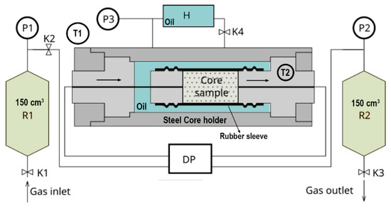 where ƞ is the dynamic viscosity of the gas, Pa·s; L is the sample length, cm; S is the sample cross-sectional area, cm2; V1 is the reservoir volume, cm3; p1 is the pressure at sensor P1 (Figure 1) at the time t1, MPa; p2 is the pressure at sensor P2 at the time t1, MPa; p10 is the pressure at sensor P1 at t0 (start), MPa; p1k is the pressure at sensor P1 at tk (end), MPa; K is the gas permeability, mD.