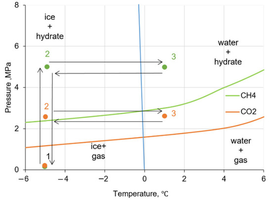 Natural gasses such as methane can exist in the form of hydrates, which constitute rich unconventional resources of hydrocarbons. Gas hydrates are crystalline clathrate compounds formed out of water molecules and low-molecular gas under certain pressures and temperatures [1,2,3,4]. Large amounts of greenhouse CO2 are sequestered in gas hydrates in marine bottom sediments and permafrost within the shallow lithosphere, where the conditions are favorable for their formation and stability [5,6,7,8]. Carbon dioxide buried in hydrate form is highly concentrated; each cubic meter of pore CO2 hydrate can store about 120 to 162 cubic meters of gas, even if the saturation is incomplete [9].