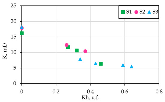 The gas permeability of S1 decreased from 16.24 mD to 11.27 mD as Kh grew to 0.27 u.f. Upon further conversion of pore ice to hydrate, up to Kh = 0.46 u.f., gas permeability decreased to 6.42 mD, or 2.5 times lower than the initial value. Hydrate formation in S2 (to Kh = 0.26 u.f.) at −5 °C led to 1.5-fold decrease of gas permeability. As the hydrate coefficient increased to 0.37 u.f., gas permeability reduced by an additional 16%. Heating of the sample to +1 °C led to Kh change from 0.37 to 0.48 u.f., while the permeability decreased only slightly from 10.44 to 10.17 mD and then to 8.92 mD when the sample was frozen back to −5 °C, i.e., it became almost twice as low as prior to hydrate saturation. Hydrate saturation of S3 occurred at negative temperature only (−5 °C). Gas permeability decreased from 18.11 mD to 7.88 mD as Kh grew to 0.34 u.f. and further to 5.47 mD at Kh = 0.64 u.f., or three times lower than the initial value (Figure 3).