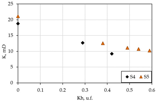 The formation of methane hydrates in the frozen sediments at −5 °C likewise led to a gas permeability decrease (Table 3; Figure 4). As 42% of pore ice in S4 converted to hydrate, its permeability changed from 18.76 mD to 9.23 mD, or became almost twice as low as prior to hydrate formation. Thawing of the sample at +1 °C led to a permeability decrease to 1.60 mD (five times lower than the initial value), due to additional hydrate formation upon thawing as well as to uneven distribution of locally migrating moisture [35]. Formation of methane hydrate in S5 at −5 °C was accompanied by Kh increase to 0.59 u.f. and the ensuing gas permeability decrease from 21.08 mD to 10.25 mD.