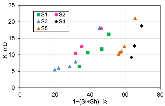 Calculations predict that the total ice + hydrate saturation during conversion of pore ice to hydrate increases on account of the ~15% difference in specific volume between ice and gas hydrate [34,35]. As a result, the pore space shrinks (1 − (Si + Sh)), and the permeability reduces correspondingly (Figure 5).