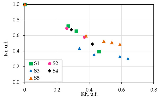 It should be noted that a significant decrease (by up to five times or more) in the gas permeability of frozen hydrate-containing rocks occurs during their thawing under conditions of hydrate formation, when new gas–water contacts arise in the pore space, causing additional hydrate formation. Thus, an increase in the temperature of a frozen hydrate-containing sand sample from −5 °C to +1 °C led to gas permeability shifting from 9.23 mD to 1.60 mD, while Kh increased from 0.42 to 0.51 (Table 4).