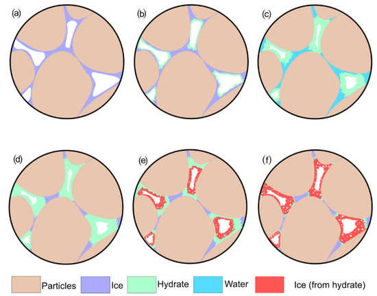 Pore space changes in gas-saturated sediments exposed to hydrate formation at t < 0 °C, thawing and freezing, and hydrate dissociation at t < 0 °C. Stages: (a) initial (before hydrate formation), (b) hydrate formation at t < 0 °C, (c) thawing, (d) freezing, (e) self-preservation of pore hydrate at p = 0.1 MPa, (f) hydrate dissociation at N2 atmosphere, p = 3 MPa.