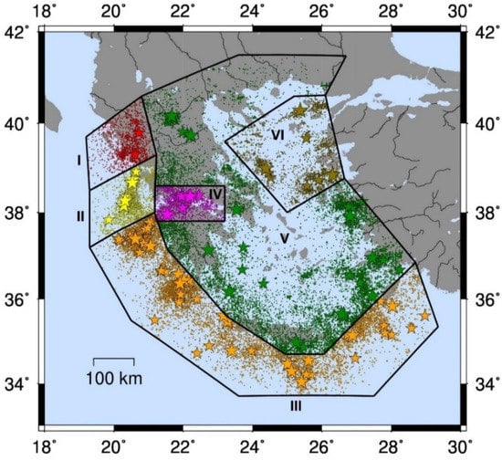 Following the approach of Page et al. [], we estimated mean regional aftershock parameters to optimally detect spatial variations in productivity and aftershock decay that may signify variations in the predominant stress field and tectonic loading processes. The study area was divided into distinct tectonic regions (Figure 1), based on the general zonation scheme suggested by Vamvakaris et al. []. Ultimately, six seismic zones were defined based on common seismotectonic characteristics. Zones I and III are generally related to reverse or thrust faulting, Zones II and VI to strike-slip faulting and IV, V to normal faulting (Figure 2).