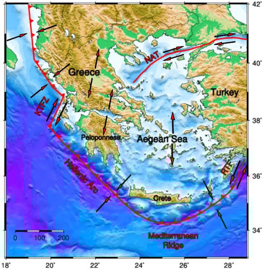 The main geodynamic features of Greece. Red lines denote the active boundaries and the red arrows the relative motions (NAT: North Aegean Trough; KTFZ: Kefalonia Transform Fault Zone; RTF: Rhodes Transform Fault).
