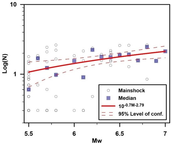 It is well documented that the number N of aftershocks following a mainshock increases with the mainshock magnitude . This pattern is expressed via the productivity law (e.g., [,,,]):