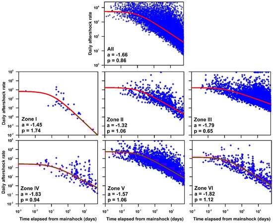 Stacked fits of the mean aftershock rates were performed using different time intervals after the mainshock occurrence (10, 60, 120 days) to test the sensitivity of the results. Furthermore, the spatial constraint that was used (3*L) was deemed as the optimum solution to secure the entirety of selected aftershocks and reduce the background events as much as possible. The b-value of the G-R law for the catalog was estimated at 1.06 through the maximum likelihood method [], with a = 3.5 considering the 95% confidence interval level of residuals. The aftershock rate analysis was then performed through two approaches. First, stacked fits were performed assuming a uniform b-value (b = 1.06) for all zones (Figure 4) and then region-specific ones were estimated (Table S1). Throughout the analysis, the c-value was set to a uniform mean value (c = 0.1) that was obtained from sequence-specific MOL fits.