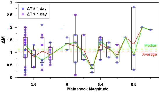 Magnitude difference (ΔΜ) between the mainshock and its largest aftershock. Dashed green and red lines correspond to the median and average ΔΜ, respectively.