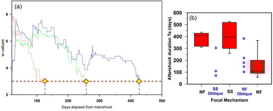 (a) Examples of the methodology applied to estimate Ta for a strike-slip (green), normal (blue) and reverse (orange) faulting mainshock. The dashed horizontal line denotes the threshold value of wt = 3 corresponding to 99.9% significance level. (b) Results for all seismic sequences are presented classified by faulting style (NF: Normal Faulting; SS: Strike-Slip; RF: Reverse Faulting; SS Oblique, RF Oblique).