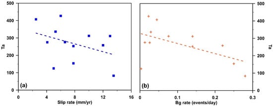We then examined the dependence of on the background seismicity rate and fault slip rate, both being proxies of the stressing rate. Background seismicity rates () were calculated using seismicity up to 4 years prior to the mainshock occurrence and geodetic slip rate data were acquired from the literature (e.g., []). Fault slip rates were estimated according to the coupling ratio to account solely for its coseismic portion []. Our analysis suggests that both and slip rates exhibit weak to moderate inverse correlation with (Figure 7). Therefore, appears to be more closely related to stressing rate than to the mainshock magnitude, a view that is consistent with the rate-and-state friction law [].