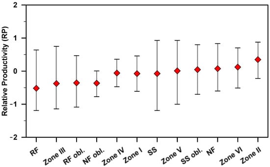Relative aftershock productivity (RP) in relation to the style of faulting classification (RF, SS, NF, RF oblique, SS oblique, NF oblique) and according to the zonation scheme of this study (Zones I–VI). Red diamonds represent the median RP-value, and the caps denote the extent of calculated RP-values.