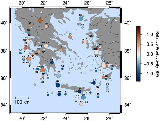 Figure 9 illustrates the RP ranking of the selected seismic sequences (Table 1 and Table S3) along with 11 cases of isolated mainshocks which were not assigned with an RP-value. From the spatial distribution of RP-values, regional variations are once again highlighted as well as presumable anomalies in adjoining regions. First, the western part of the Hellenic Arc is more productive than its central and eastern parts, hosting intense seismic sequences such as the 6.8 Zakynthos 2018 (e.g., []), the 6.8 Methoni 2008 (e.g., []) or the remarkably prolific 5.7 Zakynthos 2006 seismic swarm (e.g., []) (mainshocks 63, 36 and 29, respectively; Table 1). Moving towards the eastern part, the vast majority of seismic sequences exhibit negative RP-values apart from the cases of 6.4 S. Crete 2009 [] and the 6.1 Kasos 2015 [] (mainshocks 42 and 55; Table 1).