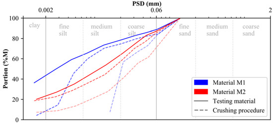The raw calcite (0–200 μm) and dolomite (0–100 μm) used for laboratory testing were provided by the DOLOMIT Eberstein Neuper GmbH. To account for muscovite, quartz and feldspar within M2, the dolomite raw material was mixed with the embankment material of a trial embankment from an Austrian basin in the ratio of 50/50. Since both testing materials (M1, M2) should present a particle size distribution (PSD) similar to that of postglacial (Alpine) sediments, calcite and dolomite were crushed in several rounds using a rock crusher. As indicated by the blue and red dashed lines in Figure 1, the particle size distribution (PSD) of both materials changed significantly during the crushing procedure. The PSD of the testing material, presented in Figure 1 by solid lines, is classified according to ISO 14688-1 [49] as sandy clay-silt mixture (M1: sa’ Cl/Si) and sandy clayey silts (M2: sa’ cl Si), respectively (see below for methodology). In addition to their respective PSDs, results of particle density and Atterberg limits (ATT) are summarized for both materials in Table 1.