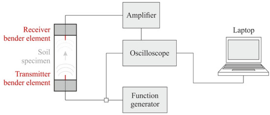 Bender elements (BE) consist of two piezoceramic bimorph sheets (e.g., zirconate titanate and lead titanate) with external conducting surfaces sandwiching a conductive center shim (e.g., ferrous nickel) [52]. Thereby, the lack of crystal symmetry or the electrically polar nature of the crystals results in piezoelectricity [53]. These electromechanical transducers enable the conversion of mechanical to electrical energy and vice versa. If a driving voltage is applied to the bender elements, they bend due to the polarization and act as a transmitter. On the other hand, if these elements are mechanically forced to bend, voltage is generated (receiver). Here, parallel type bender elements with a dimension of 12 × 12 × 1.2 (length × width × thickness in millimeters) and an additional polyurethane coating were used and placed within a triaxial device. The configuration shown in Figure 3 was chosen for the present study, where a function generator produces a defined input voltage that is sent to the oscilloscope and the transmitter bender element (situated within the top cap of the triaxial device).