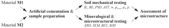 where Xm is the number of gas molecules needed to form a monolayer, X represents the adsorbed gas molecules at a given relative pressure (p/p0) and C* is a constant related to the heat of adsorption. Based on a linear regression, Xm can be computed and used to determine the specific surface area as,BET (m²/g). The pore volume and the pore size distribution of the specimens were determined by incrementally increasing the gas pressure until all pores are filled. The evaluation of the adsorption and desorption isotherms was made using the BJH (Barrett, Joyner and Halenda) calculations [68]. The flowchart, shown in Figure 4, summarizes the individual steps of laboratory testing.