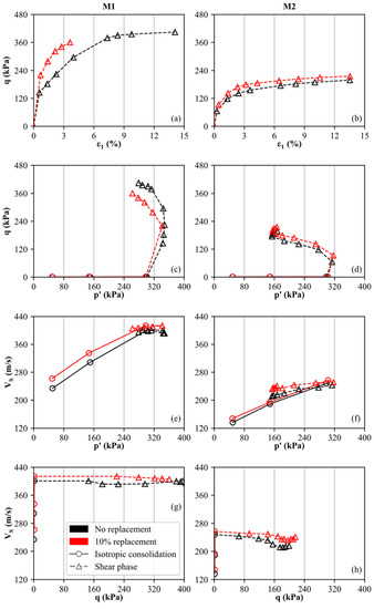 At defined stress levels (p′1 = 50 kPa, p′2 = 150 kPa, p′3 = 300 kPa), the cemented specimens display higher VS values compared to the uncemented samples, even though the difference between the cemented and uncemented specimens decreases slightly with destructuration (increasing p′). Since the absolute VS measurements are higher for M1 compared to M2, it is confirmed that the carbonate-dominated soil is characterized by a stiffer behavior. Furthermore, a slightly stronger fabric is assumed for M1 since the difference between the cemented and uncemented specimens is slightly larger compared to M2. However, for p′1 = 50 kPa, the ratio of cemented to uncemented shear wave velocity does not exceed 1.2 for both materials. In contrast, bender element results of artificially cemented sands (using the MICP technique) lead to ratios of >2.5 for similar calcite contents [79]. From Figure 6g,h, it can be seen that the change in shear wave velocity is small within the shear phase as p′ and q show the reversed trend. As the decrease in p′ is smaller compared to the increase in q, it is confirmed that p′ has a stronger influence on VS than q.