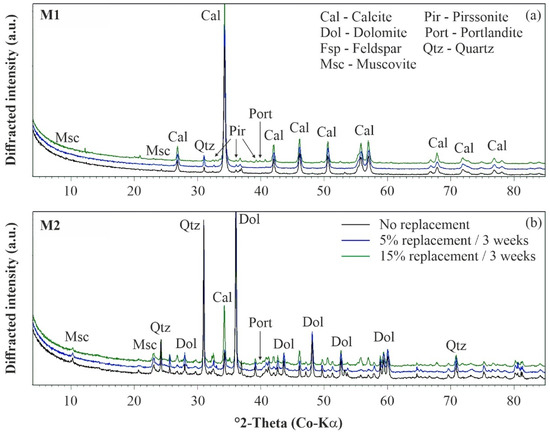 Mineralogy of uncemented and artificially cemented soil specimens: (a) M1 and (b) M2. XRD patterns have been shifted vertically for better visibility.