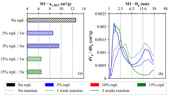 In addition, the pore size distribution of soil specimens is compared for M1 in Figure 9b. The differential pore area (dVp/dDp) varies between 0.0007 and 0.0015 cm3/g for pore sizes ranging from 1.3 to 35 nm. The local maxima are reached at pore sizes equal to 2.5 and 18 nm. This pore size distribution changes as soon as nano-calcite cements are formed. While the number of pore sizes >6 nm decreases, the number of small pores <6 nm significantly increases, corroborating the (nano/micro) filler effect. This trend is most evident in the soil specimen with 15% replacement cured for 3 weeks (green, solid line in Figure 9b).