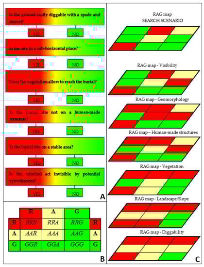 RAG color coded system applied to the search for clandestine graves and adopted in the present research. (A) RAG system conceptual model. For each question related to the considered factor: a positive answer means that the place is suitable for hosting a burial, and consequently, it indicates a site at high priority of search (assigned to Red-code); a negative answer means that it is not suitable for hosting a burial and consequently it indicates a site at low priority of search (assigned to Green-code). (B) An example of color-code matrix to explain the method for assigning RAG color-codes to each area of the RAG map. (C) Scheme based on the conceptual model (A) for constructing the RAG map search scenarios. The search scenario is obtained crossing geographical information from the RAG maps related to the six suitable factors.