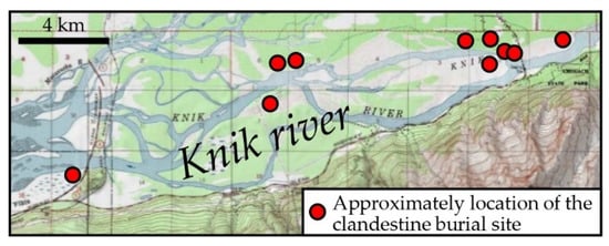 Fifty years later, in Alaska, during the 70s–80s, Robert Hansen, a psychopathic serial killer, concealed his victims underground after committing sexual and sadistic type homicides [,,]. Hansen used to bury most victims in shallow clandestine graves dug along the banks of the Knik river (Figure 2). This glaciated valley flows in an inhabited area characterized by highly braided channels of easy to difficult diggable alluvial plain deposits chiefly formed of sands and gravels containing cobbles, silts, and clays. Hansen was allured by this river where he could easily access the arduous territory with his airplane or 4 × 4 jeep [,]. Two police officers casually found the remains of one victim during hunting activities along the Knik River six months later the disappearance. Investigators found the other graves and human remains after one of the kidnapped women was able to escape and contact the police. To mark the burial sites or the crime scenes on a map may be a typical behavior of most serial killers. Hansen used to evidence the burial sites with crosses in a topographic map [,]. Additionally, in the case of the serial crimes committed by the Florence Monster, different physical evidence was found, such as a street map with two countries’ names of the crime scenes evidenced by pen [] or a painting modified by coloring and adding six little crosses [].