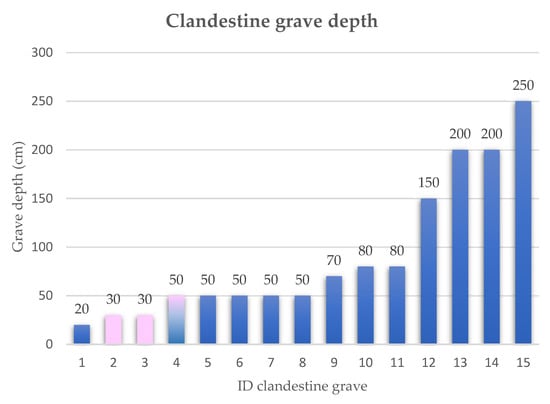 The pit depth resulted to be ranging from 20–30 to 250 cm, with an average value of 91 cm. Depths lower and higher than 150 cm usually indicate graves dug by hand with a spade, shovel, and excavator, respectively.