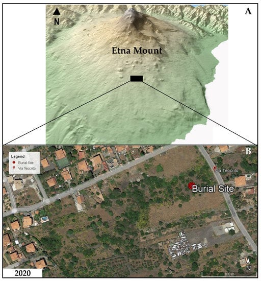 In Figure 5 the localization of the burial [,,] on Mount Etna DEM (Figure 5A) and satellite imagery (Figure 5B) through photograms captured from videos [,] is shown. Remote sensing realized through GIS technology was applied to the case study using satellite imageries, orthophotographs, and thematic maps. Remote sensing allowed to recognize the burial site in a plateau of about 200 square meters, at 611 m a.s.l.