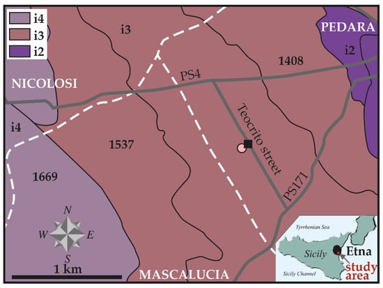 Geological map with the localization of the burial site (pink circle) [,,,,] and sample 1 (black square). Legend—Formation Torre del Filosofo of the Mongibello Unit: (i4) historical lava flows of the 1669–1971 time interval; (i3) historical lava flows of the 122 B.C. and 1669 time interval, (i2) lava flows of the 3900–122 B.C. time interval. The grey and white lines represent the main streets and the municipality limits, respectively.