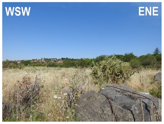 The Mediterranean Macchia is a particular plant formation formed by an impenetrable interior of shrubs and small trees no higher than 4–5 m. This formation is usually composed of evergreen and sclerophylls plants and is diffused on Mount Etna. The main plants recognized on the study area were myrtle (Myrtus communis L.), mastic (Pistacia lentiscus L.), tree heather (Erica arborea L.), black locust (Robinia pseudoacacia L.), wild blackberry (Rubus ulmifolius Schott), wild olive (Olea europaea L. var. sylvestris), and wild grape vine (Vitis vinifera L.). A vegetation and land use map of the study area was synthesized in Figure 8.