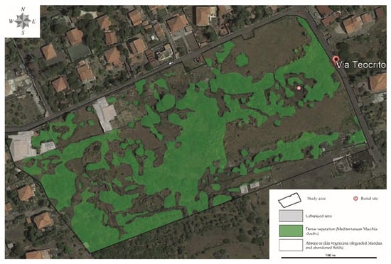 The burial site was localized on an ENE-WSW trending belt covered by shrubs of the Mediterranean Macchia (Figure 5B and Figure 6), on the back of two abandoned and uncultivated fields (Figure 5B and Figure 7).