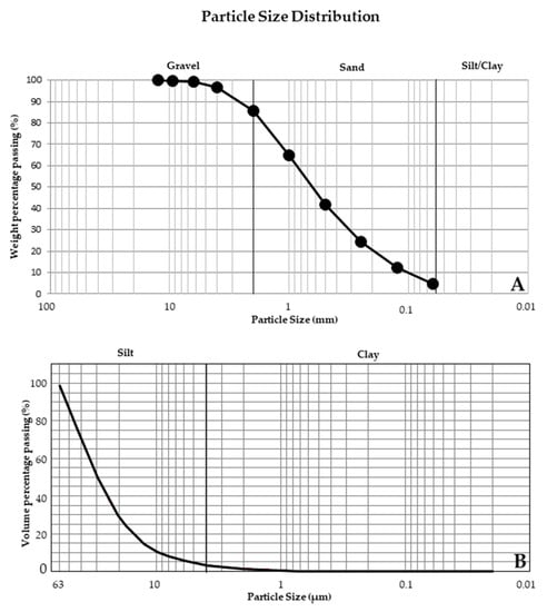 Cumulative grain-size frequency curves of the volcaniclastic deposits. (A) Distribution obtained by dry mechanical sieving of the particle size > 63 µm. The curve indicated that they consisted of gravelly sands with grains from very thick to very fine. (B) Distribution obtained by laser diffraction granulometric analysis of the grain size < 63 µm. The curve indicated that they consisted of silts (d0.9: 53.145 µm; mode: 45.870 µm).