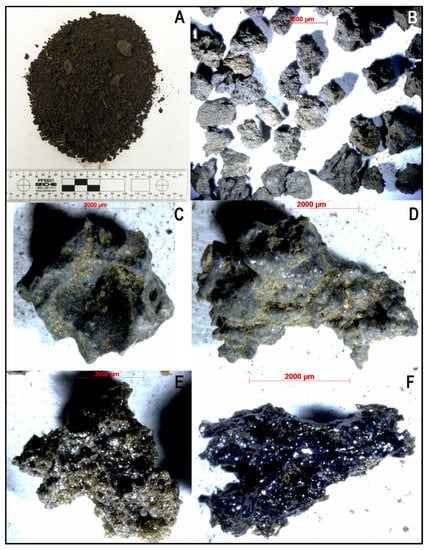 Specimen of volcaniclastic products from the case study area surroundings (sample 1). (A) Original sample before treatments. (B) Volcanic particles of the fraction retained by the sieve 4 mm, showing high angularity and roughness. (C) Sub-spherical particle. (D–F) Elongated particles. Elongated particles were glassy and with a vesicular texture and showed high angularity and roughness.