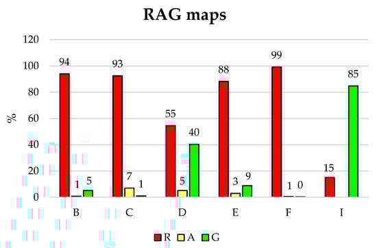 Histograms showing the percentages for each factor suitable for burial site in the RAG maps. Legend: R: Red code, A: Amber code, G: Green code. Factors for each RAG map: B—Diggability, C—Landscape/Slope, D—Vegetation, E—Human-Made Structures, F—Geomorphology, I—DSM-Visibility.
