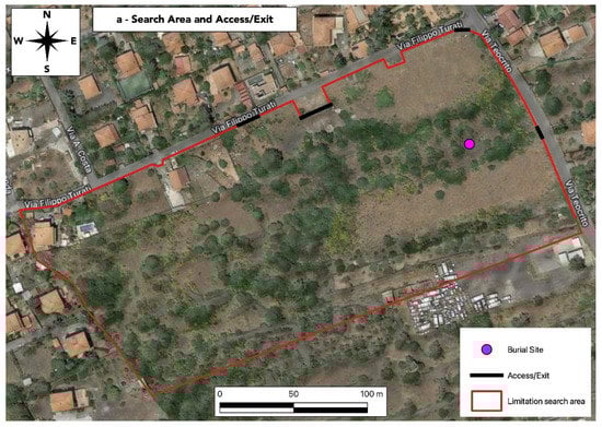 The “Limits and exit-entry points of the search area” layer (Figure 12) of the GIS platform was elaborated with the information provided by the aerial and satellite imageries from 1985 to now, the cadastral data, and investigative data provided by OSINT data. The search area covered an area of almost five hectares. Public streets mostly delimited the search area to NW (Turati Street, Figure 12) and NE (Teocrito Street, Figure 12). Along these two main streets, limits were mainly made of a wire mesh, 1 m high on Teocrito Street and 1.5 m on Turati Street, as observable from the street view function in Google Earth Pro. Limits were also given by piles of volcanic blocks or dense shrubby vegetation. The south-eastern limit fell inside a closed area with a car-storage. The exit-entry points were identified in four broken or uprooted wire sectors: two were localized in Turati Street, one in Teocrito Street, and another at the crossroad between these two streets. Along Turati Street, two parking areas were present. The westernmost area coincided with a possible exit-entry point, but the presence of volcanic blocks and detritus could hinder the crossing. The easternmost parking area was delimited by intact wire mesh 1.5 m high hindering the crossing toward the field from this site. The two exit-entry points nearest to the burial sites were the point at the crossroad and the point on Teocrito Street. The first one was nearest to the previously described parking area, at about 40 m distance. The exit-entry point in Teocrito Street was at a 100 m of distance from the first available parking site to the South.