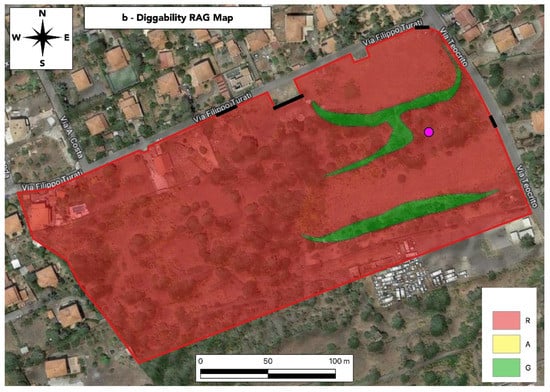 The “Diggability” layer (Figure 13) of the GIS platform was elaborated considering the aerial and satellite images, the geological/pedological maps, and the field survey of the area for identifying the outcropping bedrock and soil. The diggability qualitative evaluation was realized considering the soil features (composition, texture, structure, and engineering properties) analyzed in test pits and along some natural sections during a pre-search reconnaissance visit in the surrounding areas. The diggability was evaluated for a hole dug by hand instruments, such as a spade or hoe and shovel. The volcaniclastic products represent the most extensive outcrops of the area. The outcrops of basalts were identified along the steepest slopes to the North and the South of the burial site. Some little outcrops of basalts were not reported. The diggability resulted as very easy in the volcaniclastic gravelly sands occurring in most of the study area. The no diggable rocks were represented by basalts (Figure 13). The Diggability RAG map was characterized mainly by soil outcrops with thicknesses ranging from a few decimeters to over one meter, and second by outcroppings of basalts up to 5 m thick. The drift geology of the area was characterized by a natural granular soil showing a texture of gravelly sands (Figure 9), overlying bedrock of basalts of the San Giovanni La Punta volcanic flow. The areas with outcropping granular soils were included in the Red class (high suitability) and constituted 94% of the total. The areas with outcropping basalts were included in the Green class (low suitability) and represented 5%. The Amber class (medium suitability) included a belt 1 m wide in the transition zones and covered 1% (Figure 11 and Figure 13). The burial site fell on the Red coded area (Figure 13).