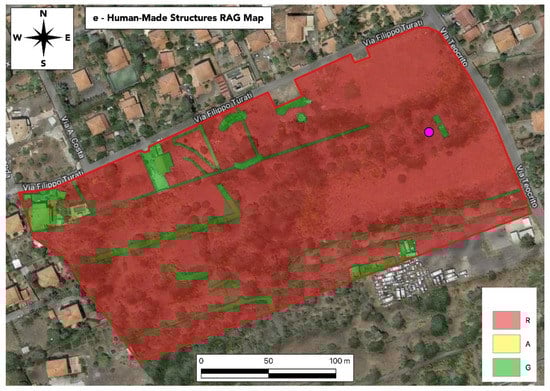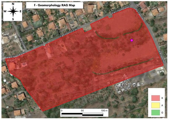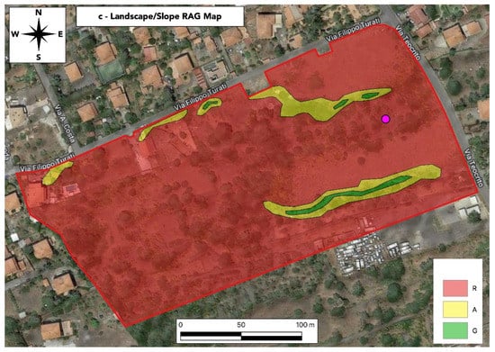 RAG map of the “Landscape/Slope” layer of the GIS platform. The burial site (pink circle) fell on the Red coded area. For the percentages of RAG color-coded areas see Figure 11.