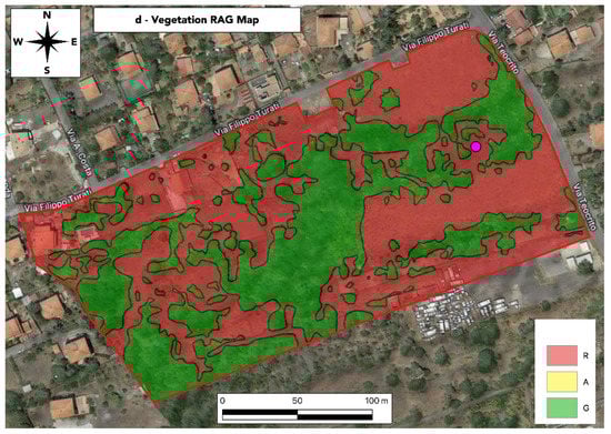 RAG map of the “Vegetation” layer of the GIS platform. The burial site (pink circle) fell on the Red coded area. For the percentages of RAG color-coded areas see Figure 11 (the Amber-coded area is not visible covering the 5% along the Red and Green area boundary).