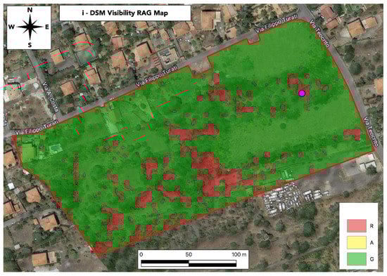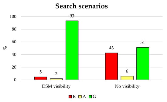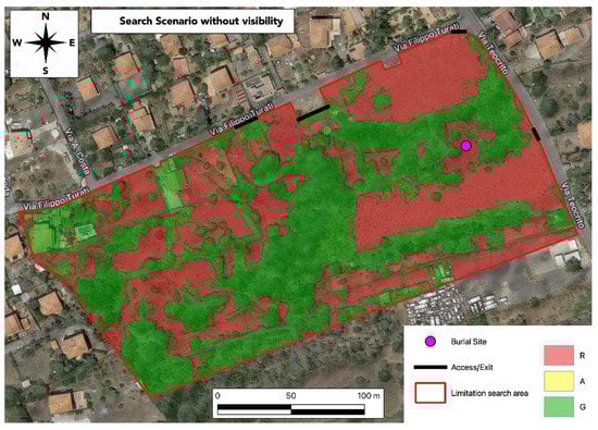 The method of the GIS-based RAG color-coded system [] was applied to the case study related to the Catania grave in order to ascertain through remote sensing activities in which RAG-color coded areas of the factor maps and search scenarios the clandestine grave fell for the consequent evaluations on the validity of the method. In the first phase, the method edited the RAG maps of the factors suitable for the burial site. The georeferenced information layers of the factors used in the GIS-geodatabase for constructing the RAG maps were related to Limits and exit-entry points of the search area, Diggability, Landscape/Slope, Vegetation, Human-made structures, Geomorphology, DSM-based Visibility (Figure 1). The percentages of the RAG coded areas obtained for each factor were reported in Figure 11.