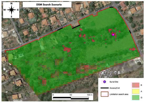 In the cases of clandestine graves, the significant factors influencing the spatial position of the investigated target may be identified and evaluated in RAG maps of the factors and RAG search scenario priority maps. The six RAG factors suitable for hosting a grave are: (i) Diggability, (ii) Landscape/Slope, (iii) Vegetation, (iv) Human-made structures, (v) Geomorphology, and (vi) DSM (Digital Surface Model)-based Visibility (Figure 1A,C) []. In particular, the Digital Elevation Models (DEMs) are useful tools in remote sensing activities for ground-search for clandestine graves, providing a georeferenced fly-through visualization of the topographic surface. The DSMs are a digital surface interpolating ground as well as vegetation and human-made structures (building, roads, etc.).