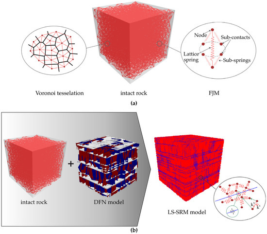 General buildup using the LS-SRM modeling approach. (a) Rock mass model utilizing the lattice-spring-based approach using Voronoi tessellation in combination with the flat joint model (FJM); (b) LS-SRM model showing the coupling of the lattice-spring-based model with the DFN model. Joint springs created by the DFN model are shown in blue.