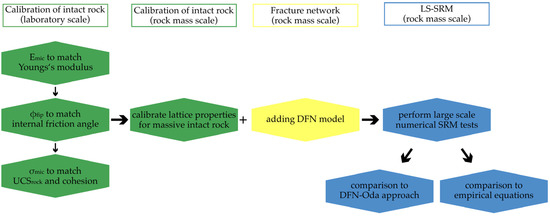A flowchart describing the various steps to determine rock mass properties based on a LS-SRM approach, including a feasible validation of the results obtained, is shown in Figure 2.