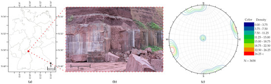 (a) Location of the Remlingen quarry in southern Germany; (b) Part of the Remlingen sandstone quarry used for the geometrical fracture network analysis and rock mechanical testing; (c) Stereonet (lower hemisphere plot) showing the fracture network orientation of the Remlingen sandstone [50].