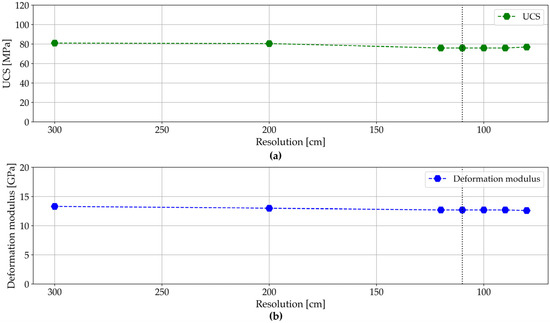 Sensitivity analysis for (a) the rock mass strength and (b) the deformation modulus depending on the lattice resolution for the Remlingen sandstone. The dotted black line marks the adopted lattice resolution of 110 cm.