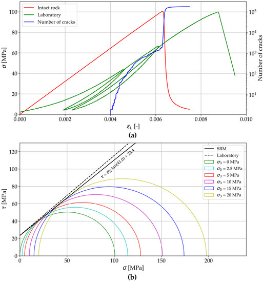 Results of the intact rock models on laboratory scale. (a) Stress–strain curve for the intact rock measured in the laboratory and the SRM model, including the evolution in the number of cracks; (b) Results of triaxial experiments at various confining pressures.