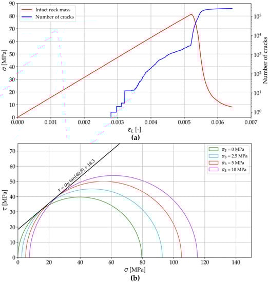 Results of the intact rock models on rock mass scale, i.e., a massive cube of 50 m edge length. (a) Stress–strain curve for the intact rock, including the evolution of number of cracks; (b) Results of triaxial experiments using various confining pressures.