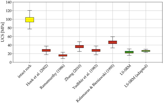 Comparison of measured intact rock and calculated rock mass strengths using the different upscaling approaches (e.g., [53,54,55,56,57]).