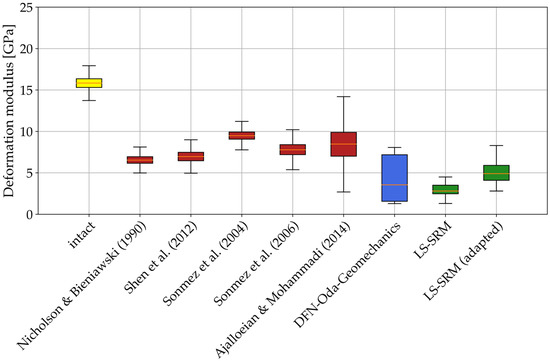 Results obtained from the calculation of the deformation modulus based on rock mass classification schemes show a range of almost 3 to 14 GPa, with a mean value of 8.6 GPa, thus differing more clearly from the results of the LS-SRM models. The lower values can again potentially be explained by the ability of the LS-SRM models to allow for fracture initiation and fracture propagation. A possible explanation is that fracture initiation in the LS-SRM models of the fractured rock mass occurs significantly earlier compared to the intact rocks, as can be seen in Figure 8 and Figure 11 as well as being described above. In addition, the empirical equations are rather sensitive to the input parameters, adding an additional factor of uncertainty to the results obtained. Nonetheless, results derived from the adapted LS-SRM models with increased fracture stiffness demonstrate that it is mandatory to compare and validate different approaches. These models show that it is potentially necessary to modify the mechanical properties of the fracture network model rather than using the laboratory results directly.